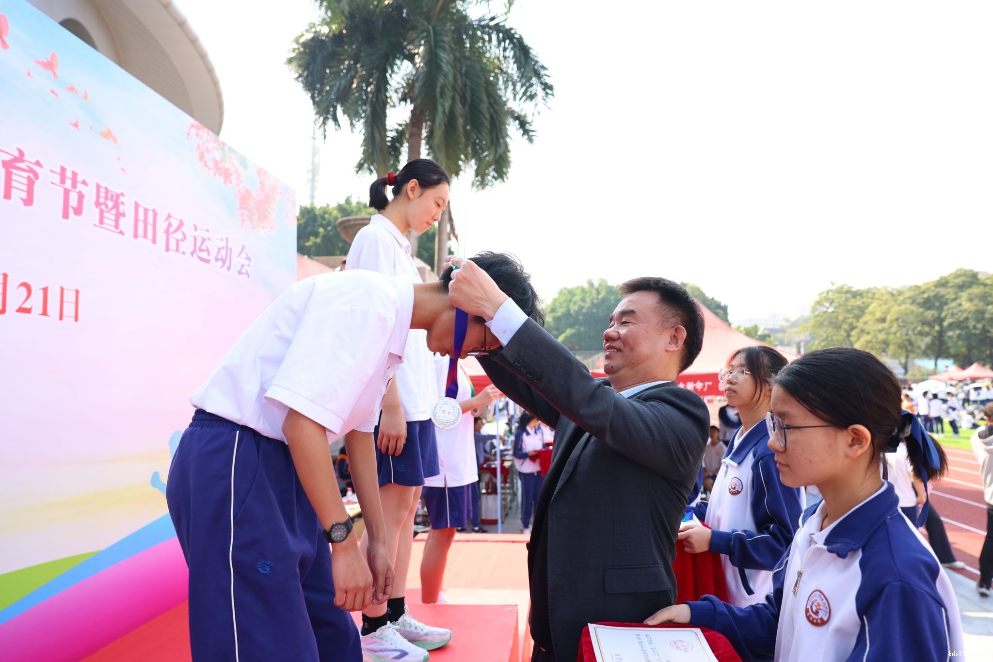 运动会当天,黄灿明书记、王健校长等学校行政亲自为每项比赛的冠、亚、季军颁发奖牌,当同学们接过奖牌,露出灿烂的笑容时,那是挥洒汗水的回报,那是拼搏的最好见证。这也将激励着同学们继续努力,不断超越自我。
